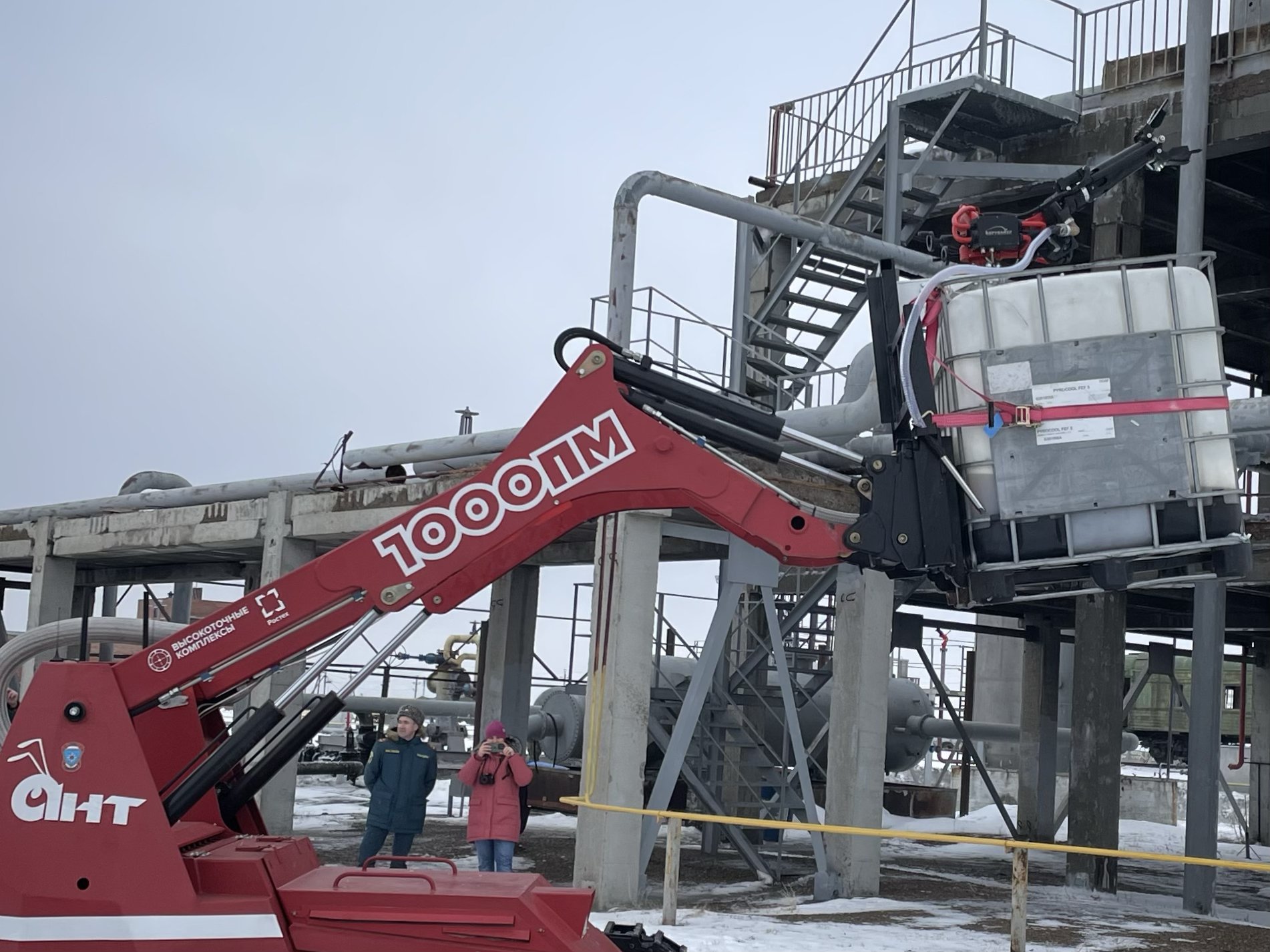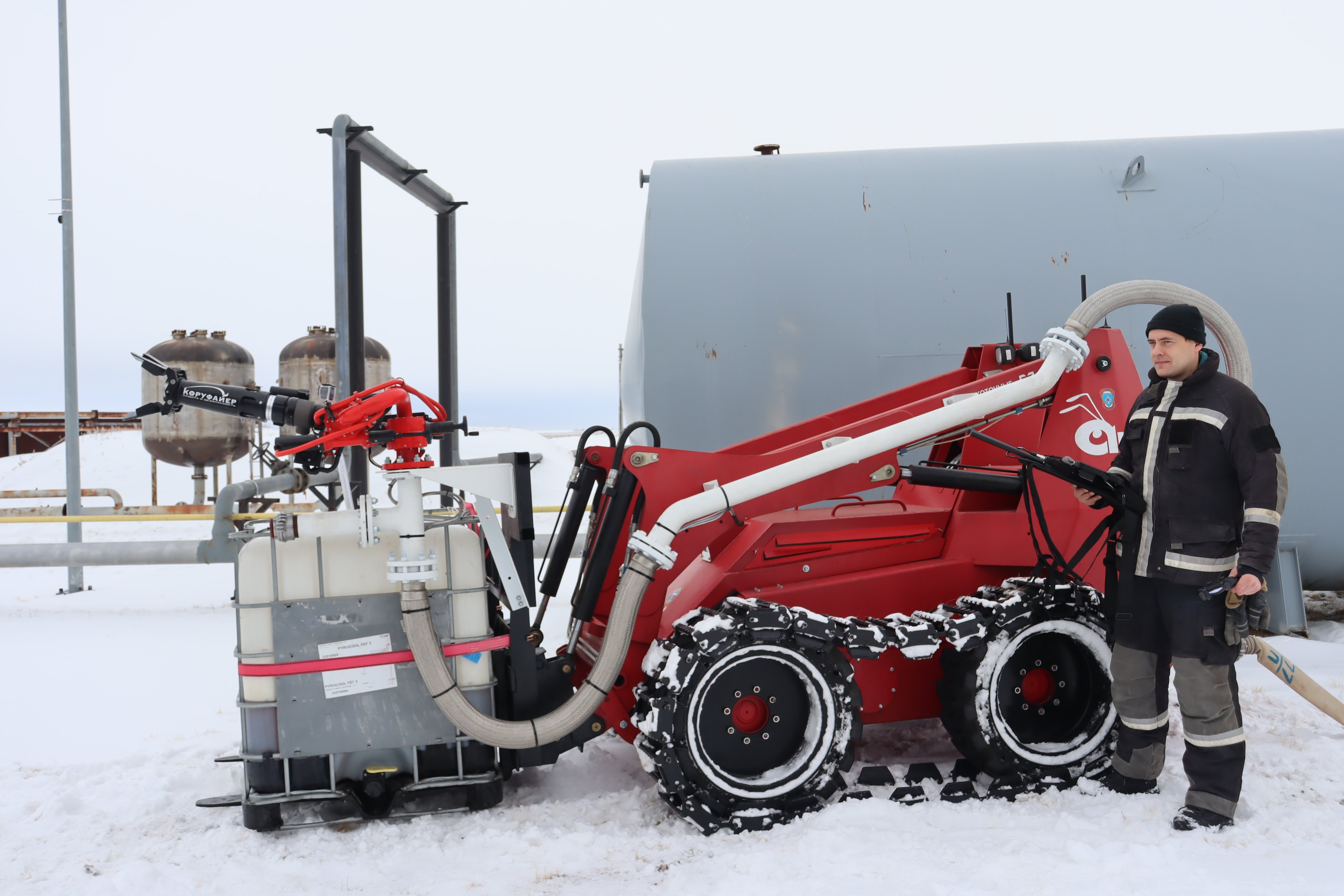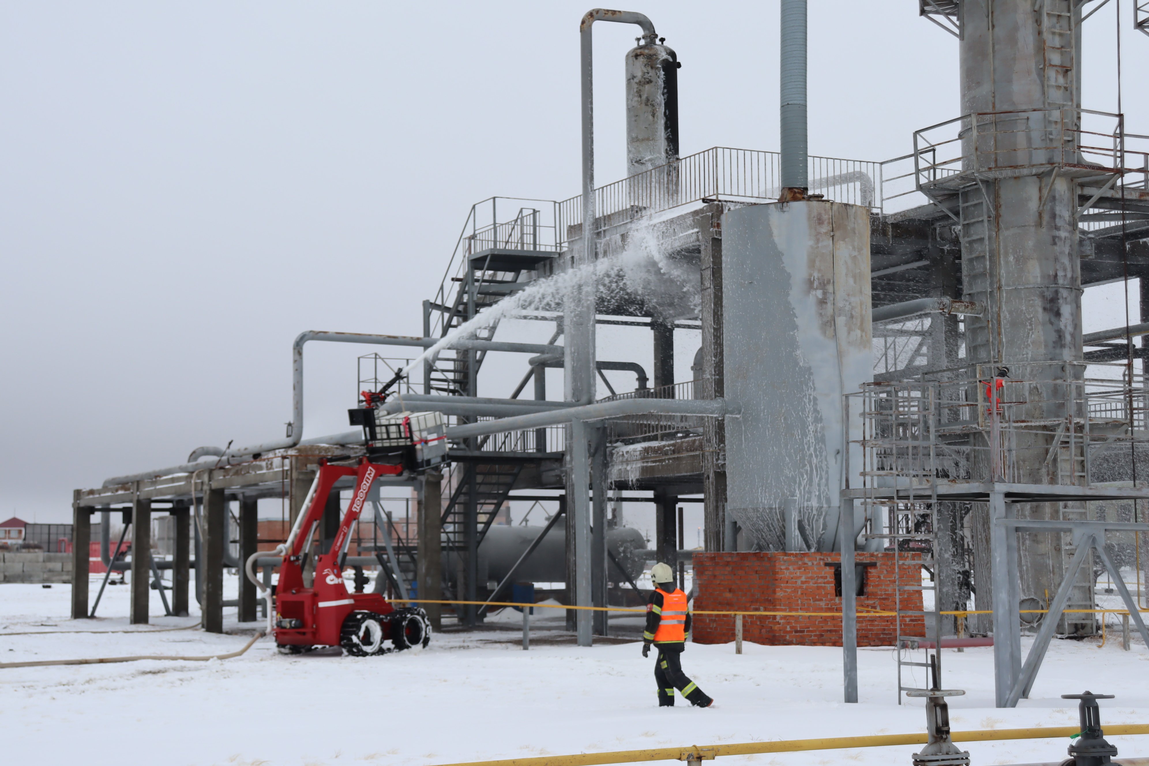 Эти испытания стали важной подготовкой к учениям по ликвидации чрезвычайных ситуаций на промышленном объекте, в ходе которых после имитации взрыва загорелась ректификационная колонна. Для ликвидации возгорания ректификационный колонны был задействован лафетный ствол «Коруфайер», входящий в состав установки «АНТ-1000ПМ», который оперативно прибыл к месту происшествия и осуществил тушение очага пожара. Уникальная конструкция ствола позволяет осуществить самостоятельный забор и дозирование пенообразователя, что обеспечивает автономность работы и повышает эффективность тушения. Данный ствол обеспечивает возможность подачи как воды, так и пены низкой кратности, эффективной при тушении пламени нефтепродуктов. Управление КРФ-ЛСД-С30(25,35) У(м) ДЕФ ЭЖ ВП осуществляется дистанционно с безопасного для оператора расстояния.