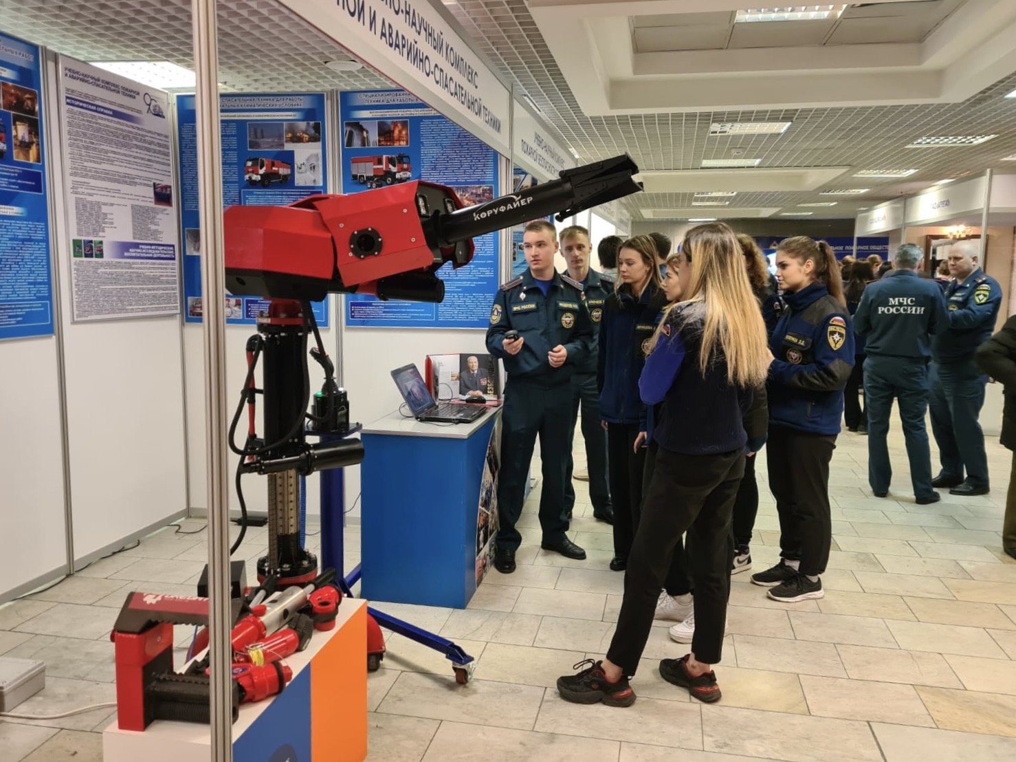В рамках конференции прошла выставка, на которой был представлен универсальный лафетный ствол с дистанционным управлением КРФ-ЛСД-С40(35,50)У ДЕФ на экстендре (подъёмном устройстве) для комплектования мобильных средств пожаротушения (пожарных автомобилей, разработанный в рамках соглашения между Академией ГПС МЧС России и ООО «КОРУФАЙЕР».
