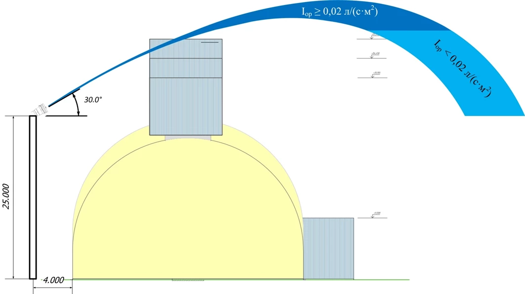 При выполнении условия установки лафетного ствола на пожарной вышке КРФ-ПВ-30 высотой 30 м и более будет обеспечиваться нормативная интенсивность орошения резервуара и будет выполняться условие подачи струй огнетушащего вещества на каждую точку защищаемой поверхности не менее чем от 2х лафетных стволов.