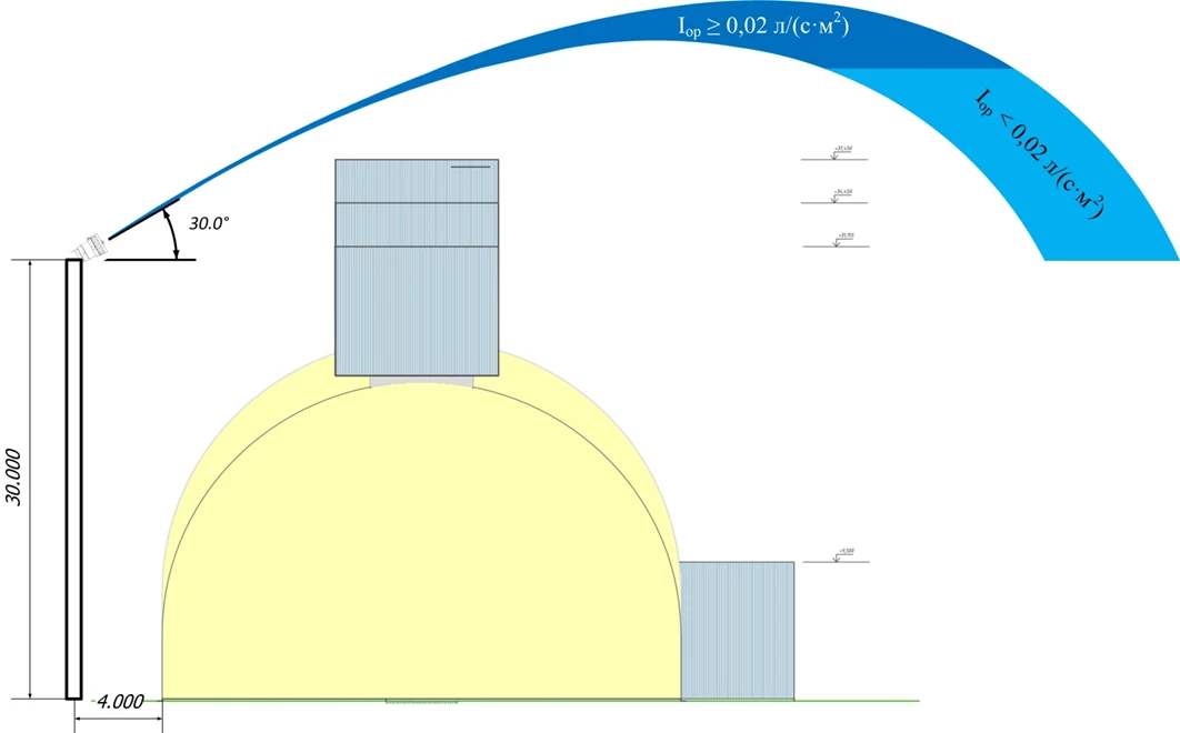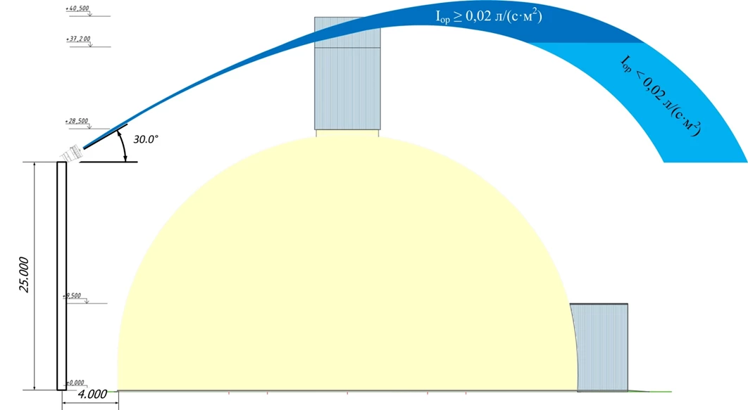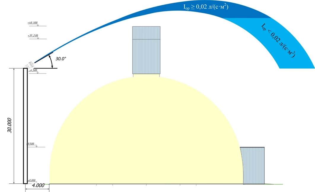 Требуется расположение лафетных стволов на пожарных вышках высотой от 30 метров (Рис. 5). Баллистика струи огнетушащего вещества обеспечивает выполнение вышеуказанных условий.